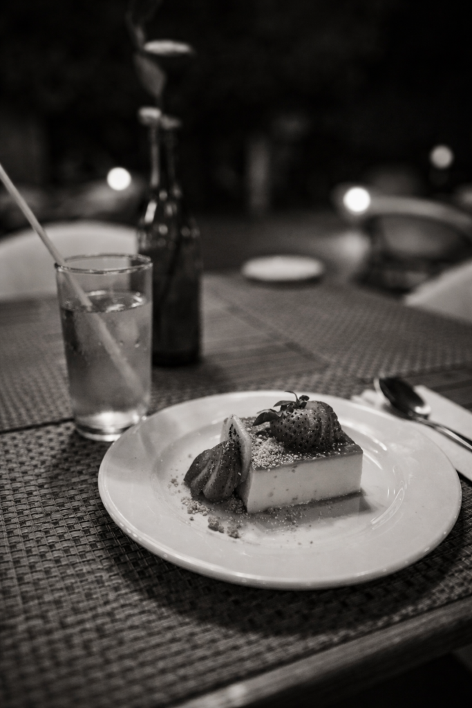 I took this photograph during a quiet evening in Loreto. A small dessert sat before me on a woven table, lit by the soft glow of fading light. In the distance, blurred lights hovered at the edge of the frame. I was alone, and I was paying attention.